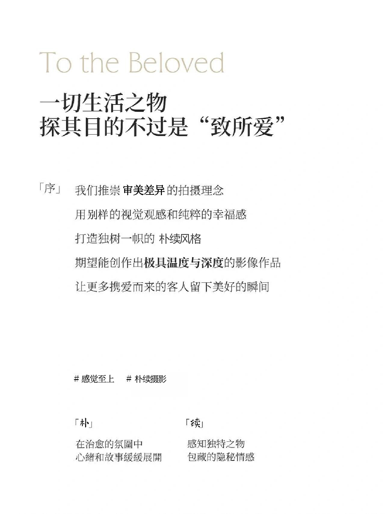 朴续 坚持“年轻、精致、幸福感”品牌内涵我们从新定义婚纱摄影,专注客户心理需求,用影像让「爱」以一件艺术品的形式呈现。致力让每一张作品都能具有让人直观认识美,感受爱的灵性